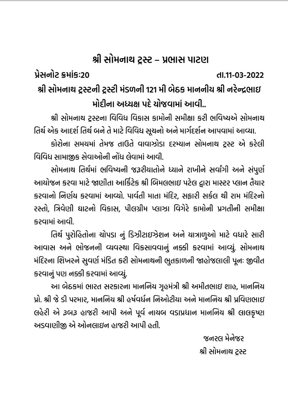 The 121st meeting of Shri Somnath Trust, held at Raj Bhavan and was chaired by PM Narendra Modi. took note of the trust’s services during the cyclone last year. The meeting was concluded with a decision to prepare a plan in contact with Bimal Patel for the overall planning of Somnath keeping in mind the future needs of the city.