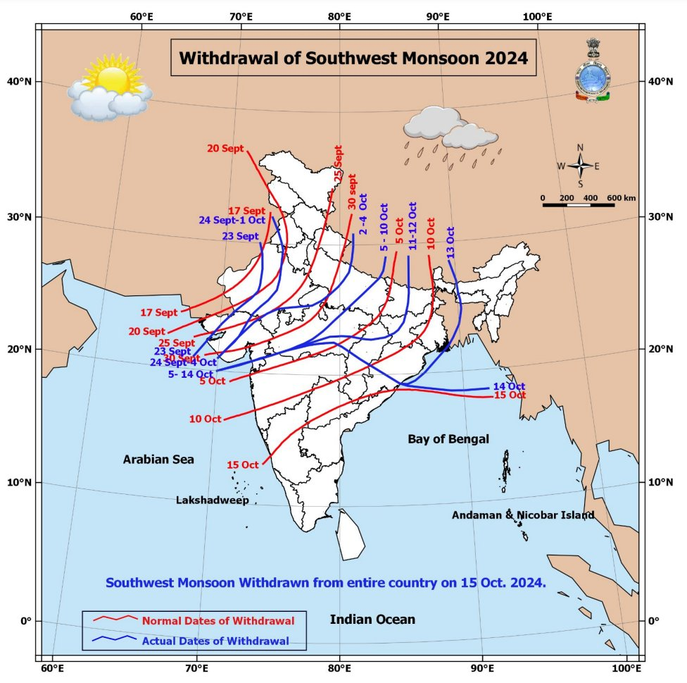 The India Meteorological Department (IMD) has announced that the Southwest Monsoon officially withdrew from the entire country on Tuesday, 15 October 2024. At the same time, the Northeast Monsoon rainfall activity commenced over South Peninsular India.