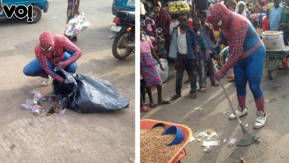 Nigerian environmentalist Jonathan Olakunle was seen sweeping the roads by disguising himself as the superhero Spider-Man, from Marvel Comics, to help clean the streets of densely populated Osogboa city of Nigeria