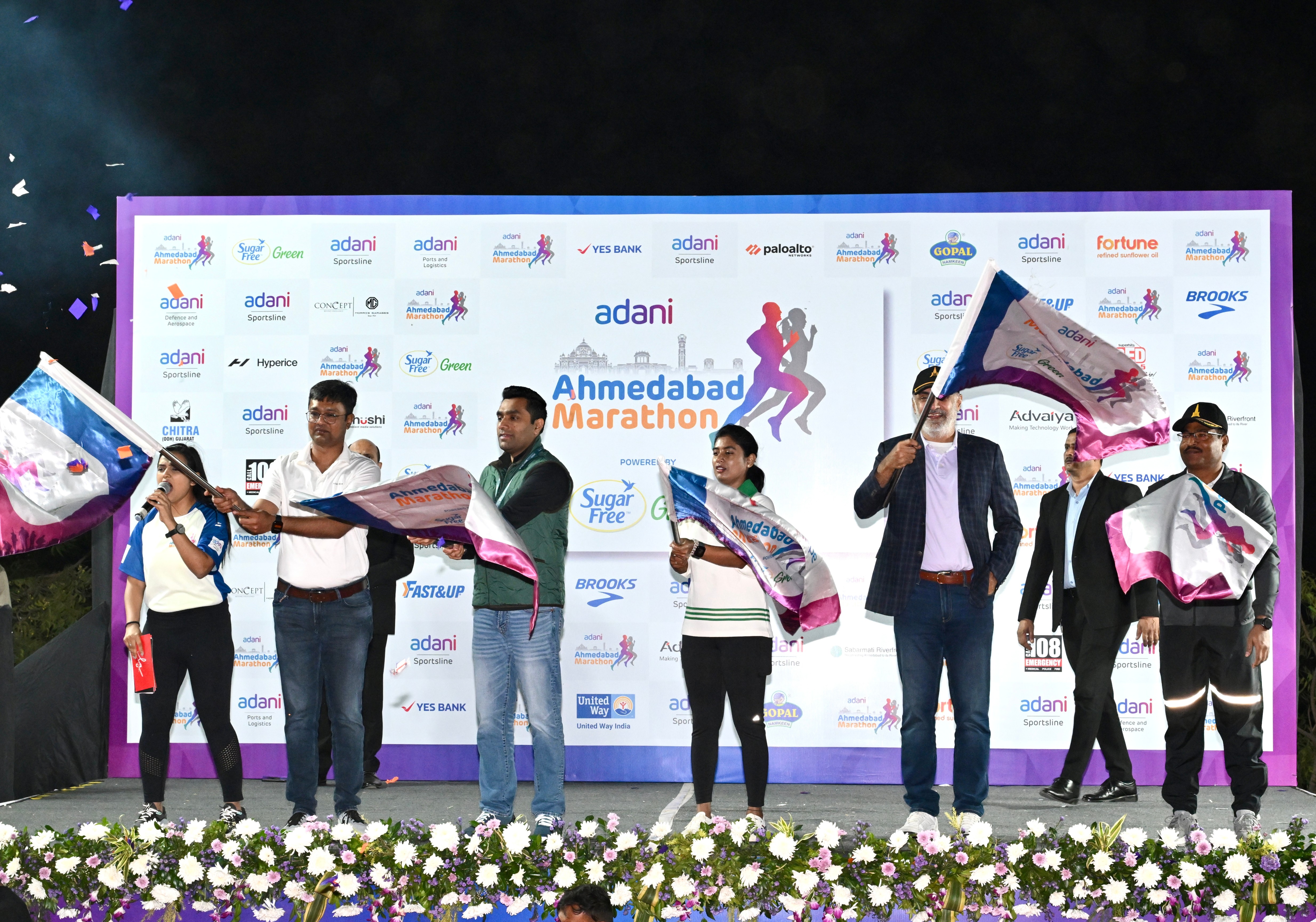 The marathon was flagged off by Air Marshal Narmdeshwar Tiwari AVSM VM and Major General S.S. Virk (GOC 11 RAPID), in the presence of Karan Adani (CEO, Adani Ports and SEZ Ltd), Dr Priti Adani (Chairperson, Adani Foundation) and Jeet Adani (Director – Airport Business, Adani Group) at the recently inaugurated Adani Sportsline-managed Sabarmati Riverfront Sports Park. Legendary cricketer Mithali Raj and popular Gujarati actor Malhar Thakar also graced the occassion.