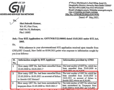 7,34,405 taxpayers surrendered their GST between March 2020 and March 2021. Department cancels the registration of 8,20,481 as taxpayers who have not filed GST returns.