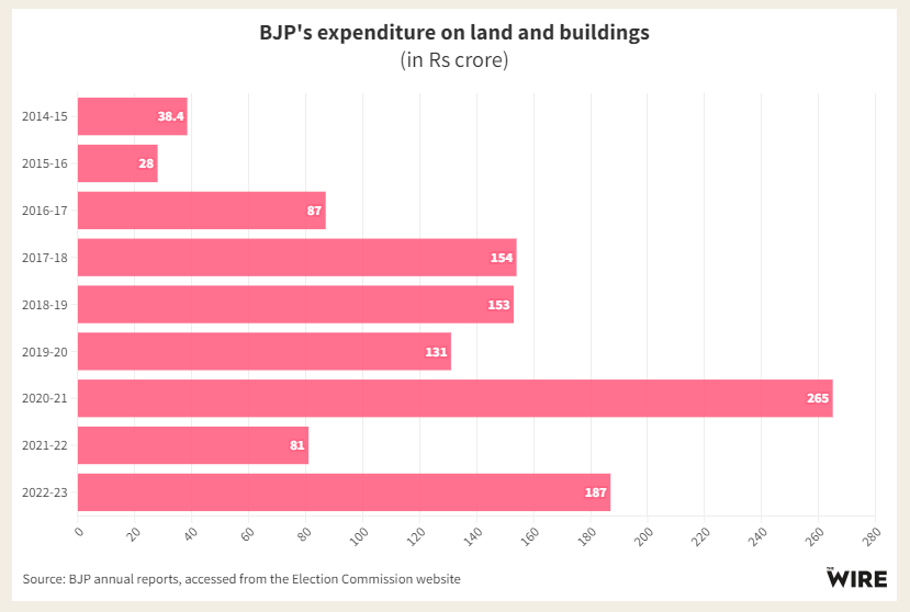 Let us start with buildings. Going by its annual reports between 2014-15 and 2022-23, the BJP has spent Rs 1,124 crore on land and buildings.