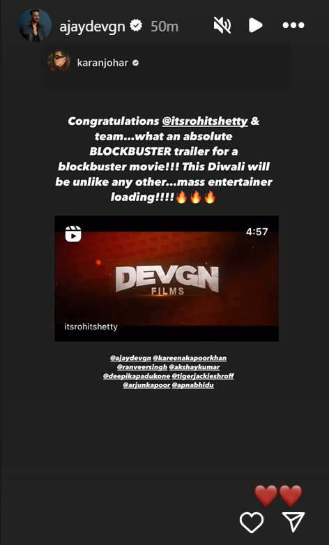 Karan Johar took to Instagram to share his excitement, posting the trailer on his stories with the message: “Congratulations @itsrohitshetty and team… what an absolute BLOCKBUSTER trailer for a blockbuster movie!!! This Diwali will be unlike any other… mass entertainer loading!!!” In response, Ajay Devgn reacted by posting heart emojis. Earlier, Alia Bhatt also praised the trailer, calling it “Next Level” and expressed her excitement at seeing such a star-studded cast, writing, “Look at all the dynamite in one frame!! Cannot Keep Calm!!!!!!”