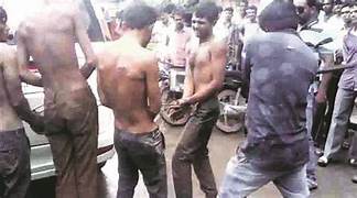 A group arrived. What followed was brutal. The men were partly stripped, tied to a vehicle, beaten with wooden sticks, iron pipes and plastic rods, and paraded half-naked through Una town. Their mobile phones were taken.