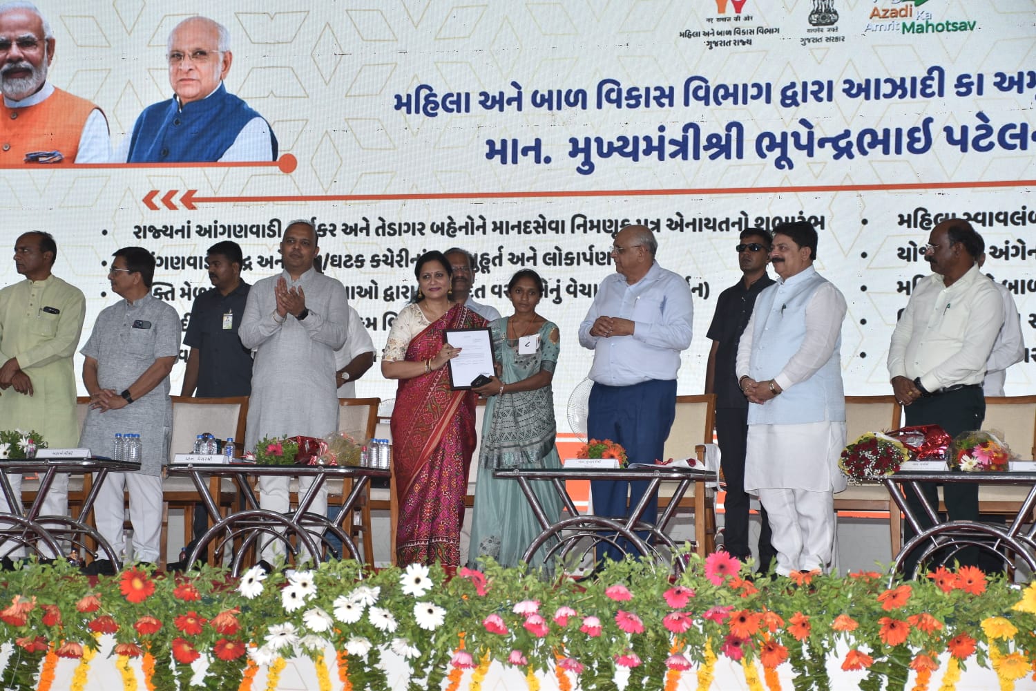 On the occasion of Azadi Ka Amrut Mahotsav, Gujarat Chief Minister Bhupendra Patel presented appointment letters to 1416 Anganwadi workers in seven districts of Central Gujarat zone and Vadodara Municipal Corporation area. The recruitment of about 7000 Anganwadi workers and Tedagars across the state has been completed through online process in a short span of only two months. Many dignitaries were present during the program.