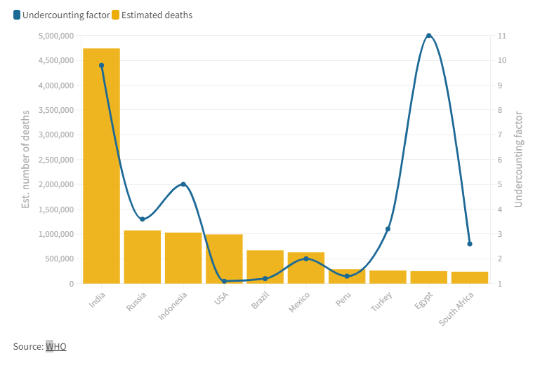 India isn’t alone in having undercounted COVID-19 fatalities. Egypt is the sole country with a higher undercounting factor than India. But India undercounted the most in absolute terms. No other country has undercounted as much – and no other country appears to have so loudly opposed the WHO’s findings either.